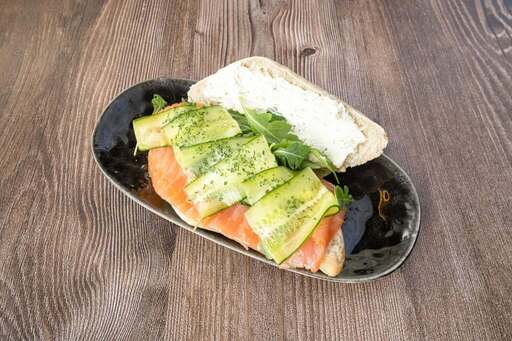 Traditioneel gerookte Noorse zalm met zachte roomkaas en sla en komkommer