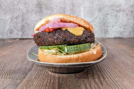 Rundvleesburger met augurk, tomaten relish, rode ui en sla