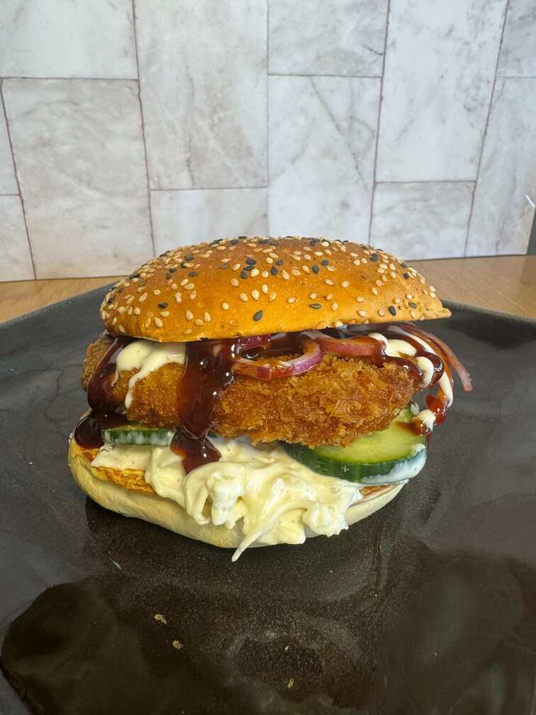Een krokante kipburger met cocktailsaus, gegrilde paprika en rode ui