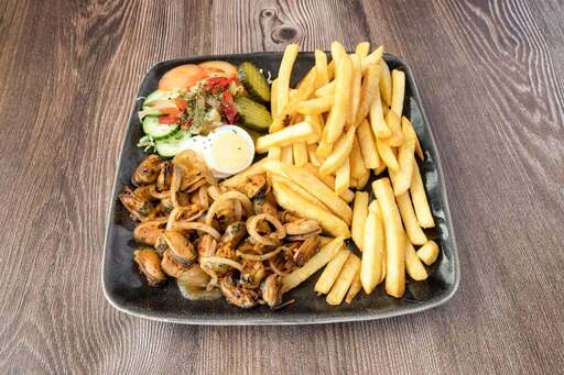 Gebakken mosselen, gebakken uien, friet en overheerlijke knoflooksaus