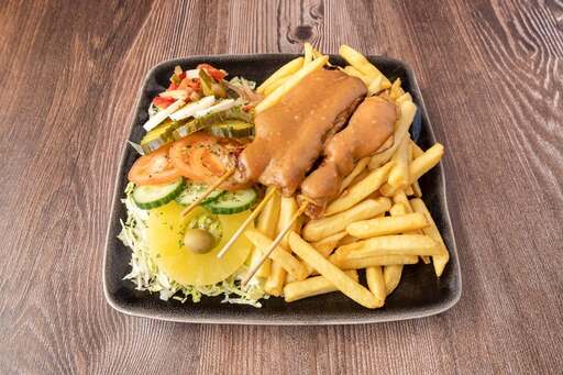 Gekruide varkensvleesreepjes, shaslick, knoflooksaus. Met friet en frisse salade