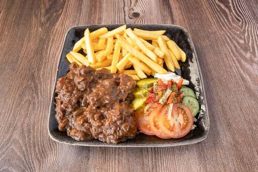 Huisgemaakte stoofvlees, friet en een frisse salade