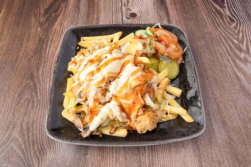 Onze beroemde kipkapsalon met gebakken ui, champignons, kaas, sla en knoflook- en chilisaus