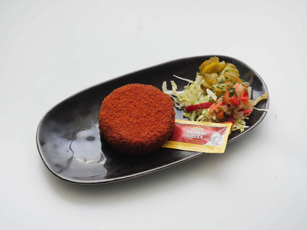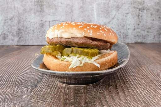 Rundvleesburger met augurk, satesaus, gedroogde uien en sla