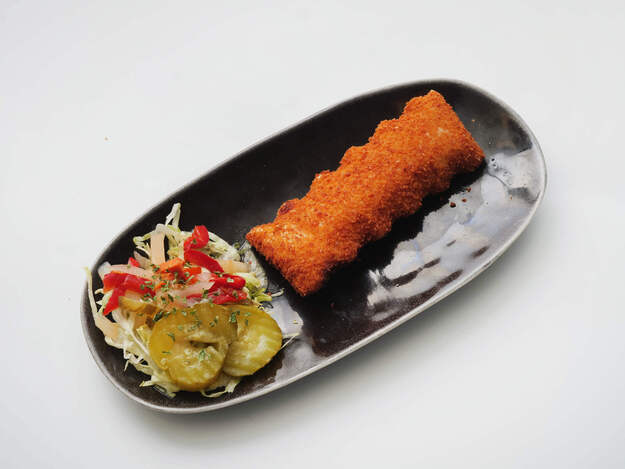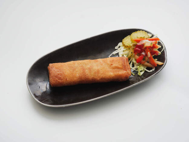 Heerlijke kip loempia met ham, trio, gebakken ei, pindasaus, een portie friet en frisse salade